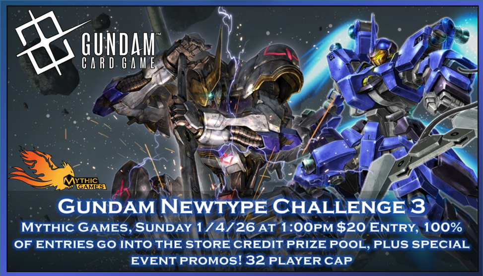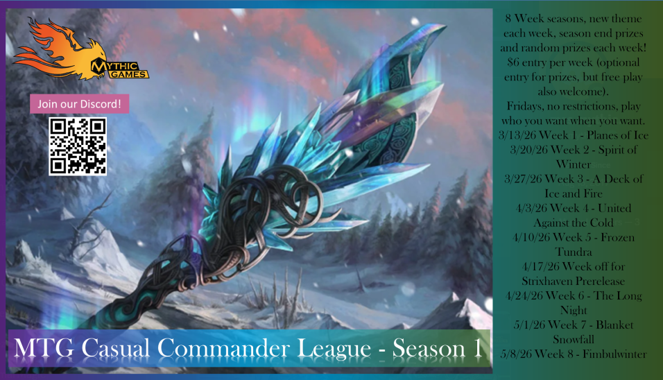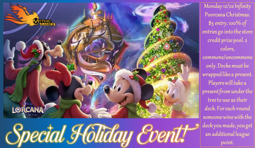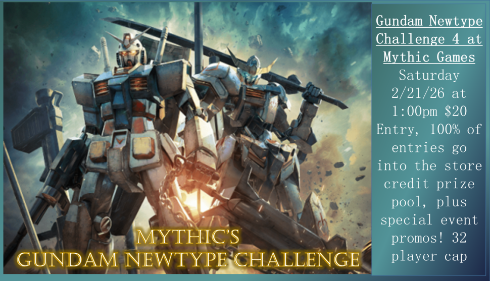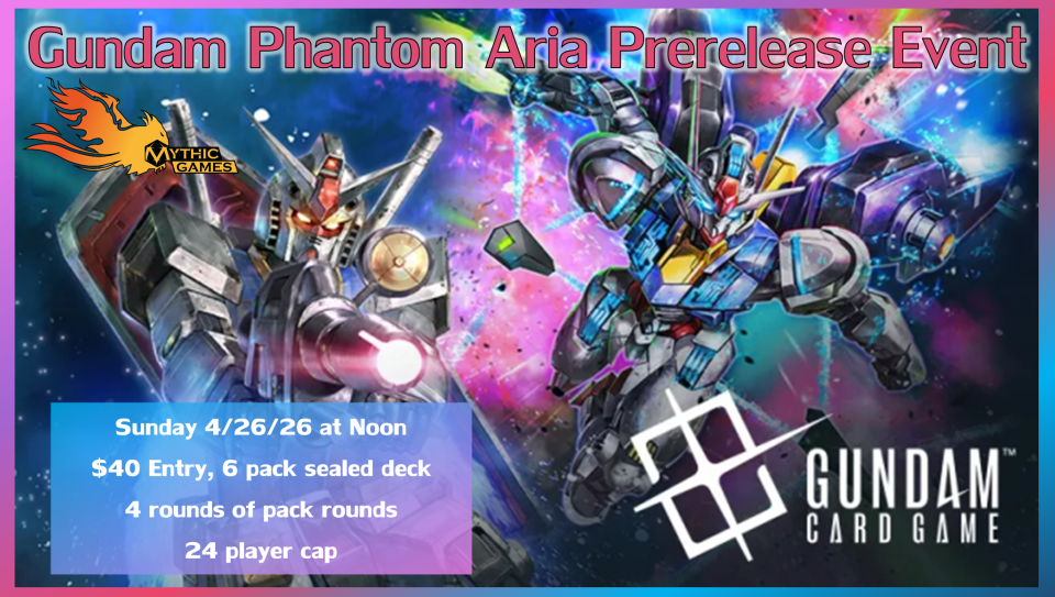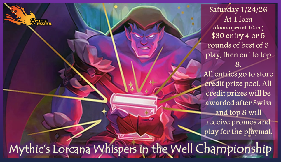 Welcome to Mythic Games! We are a one stop mom & pop shop for all your table top gaming needs. We have a MASSIVE selection of MTG singles and board games, dice, war games, TCG’s, RPG’s and tons of accessories. Recently, we expanded to 6300 square feet and have a variety of play space areas to accommodate all types of players, we even have our own TCG event room. We have worked so hard to get here and would love to see you join our community, we host a variety of events each day, please check out our calendar and come out to meet some like minded gamers, or better yet, bring a group and enjoy our vast, clean and bright play spaces.