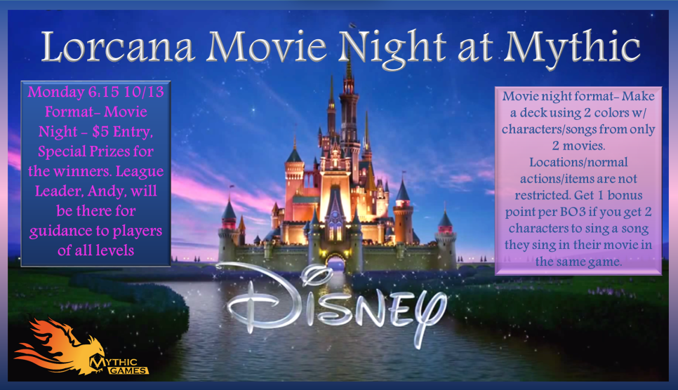 Movie Night (Make a deck using 2 colors using characters from only 2 disney movies. Locations, normal actions and Items are not restricted). Songs are restricted to the movie (Get 1 bonus point per BO3 if you can get 2 characters to sing a song they sing in their movie in the same game)