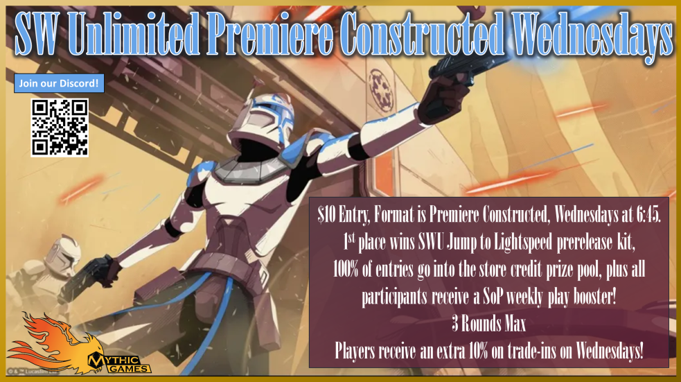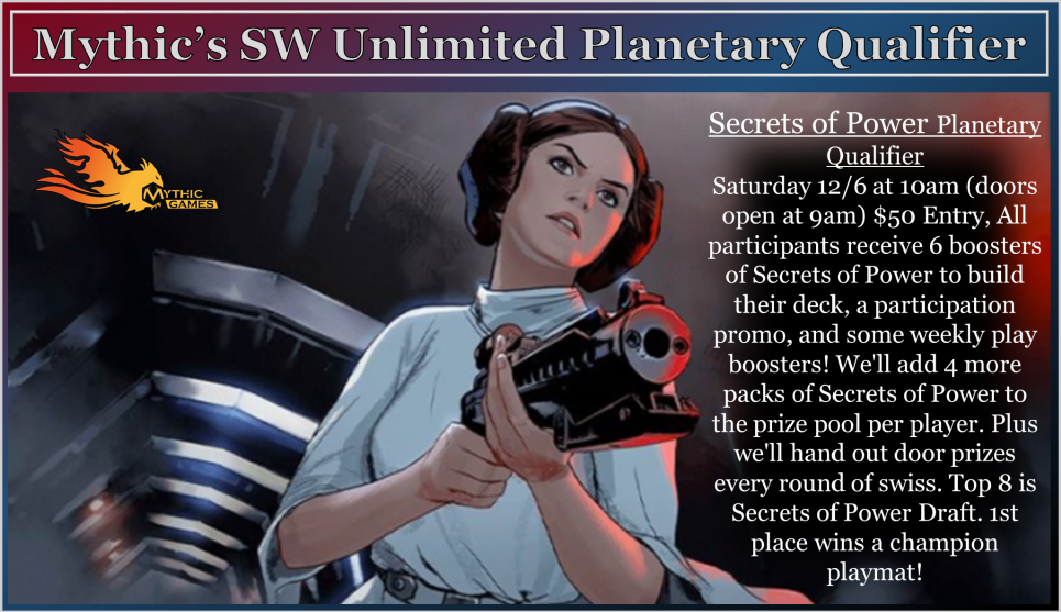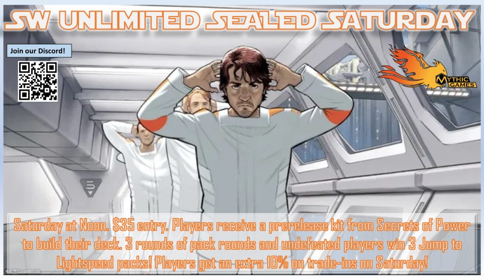 Star wars unlimited Sealed Deck Saturday at Mythic Games! Players will use a Prerelease Kit to build their deck! $35 Entry, Starts at Noon, each player gets a Secrets of Power Prerelease Kit to build their deck. We’ll run 4 rounds of pack rounds! Plus undefeated players get 3 more packs and all participants get weekly play packs! All players receive an extra 10% on their Star Wars Unlimited Trade-Ins.