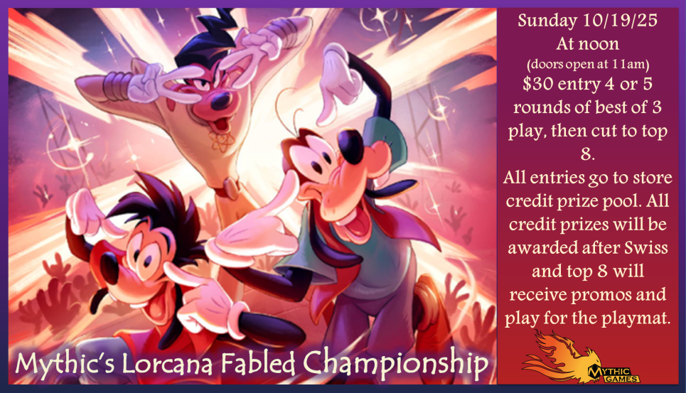 At Mythic Games we’re running Lorcana League every Saturday from 3pm-7pm.