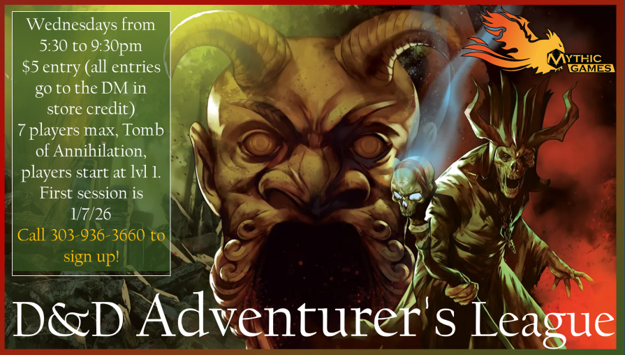 At Mythic Games we’re hosting Pathfinder Society every other week alternating Monday and Tuesday at 6pm! If you’d like to join the game please sign up here https://www.rockymountainpfs.com/viewtopic.php?t=5068