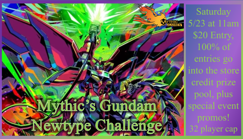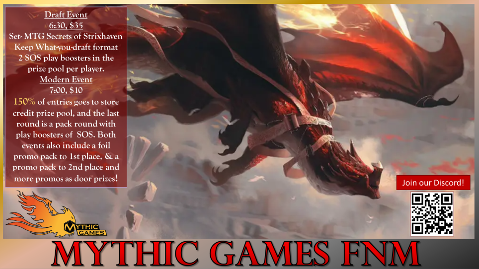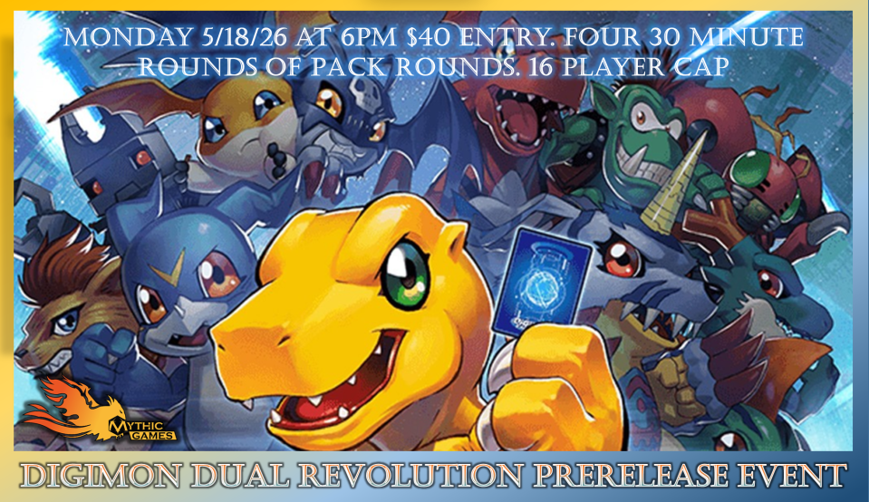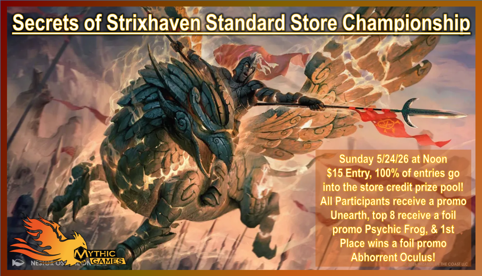 Mondays at 6:30pm, $5 entry, 100% of entries go into the store credit prize pool, plus promo pack prizes!