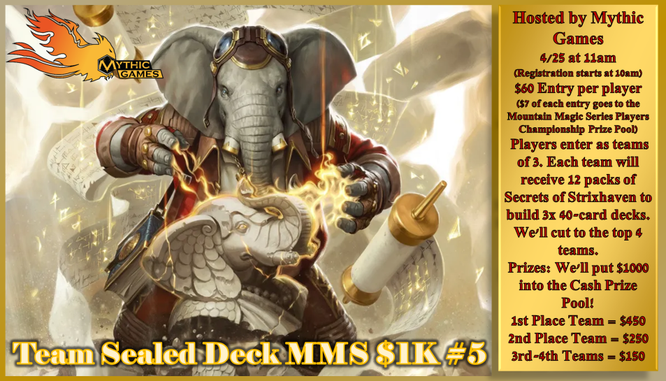 Players enter as teams of 3. Each team will receive 12 packs of Secrets of Strixhaven to build 3x 40-card decks.