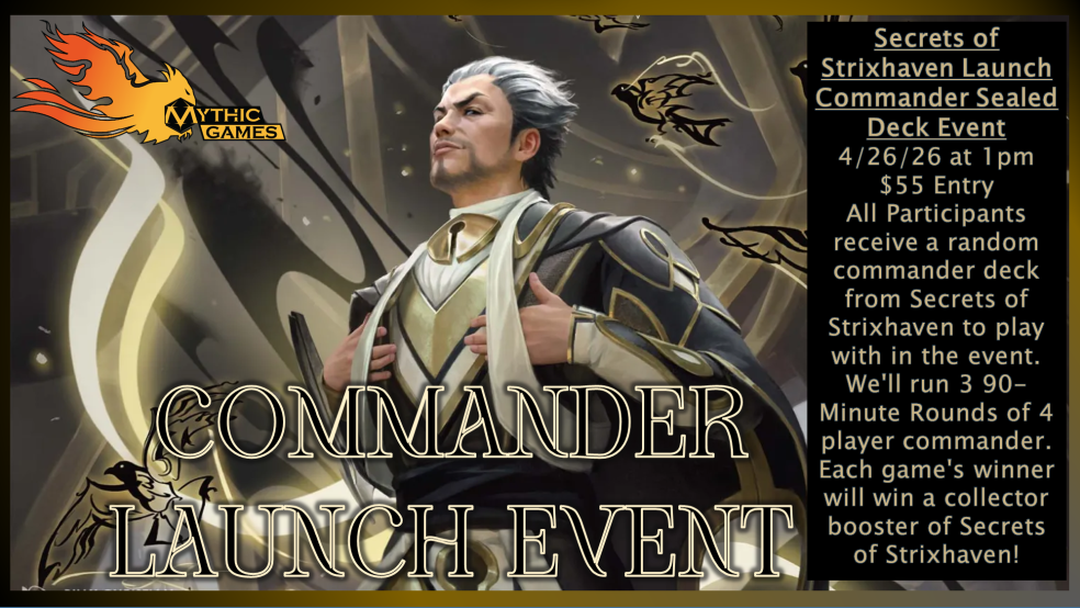 We’ll run 3 90-Minute Rounds of 4 player commander. Each game’s winner will win a collector booster of Secrets of Strixhaven!