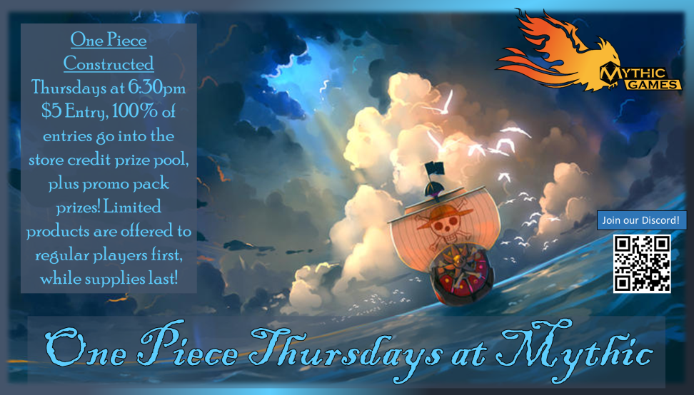 At Mythic Games we’re hosting One Piece TCG every Thursday at 6:30pm Starting on February 1st