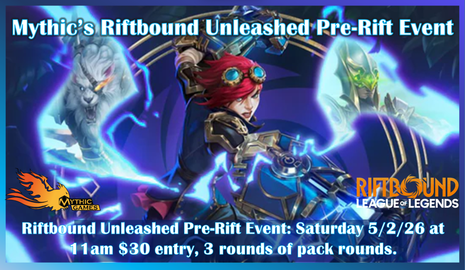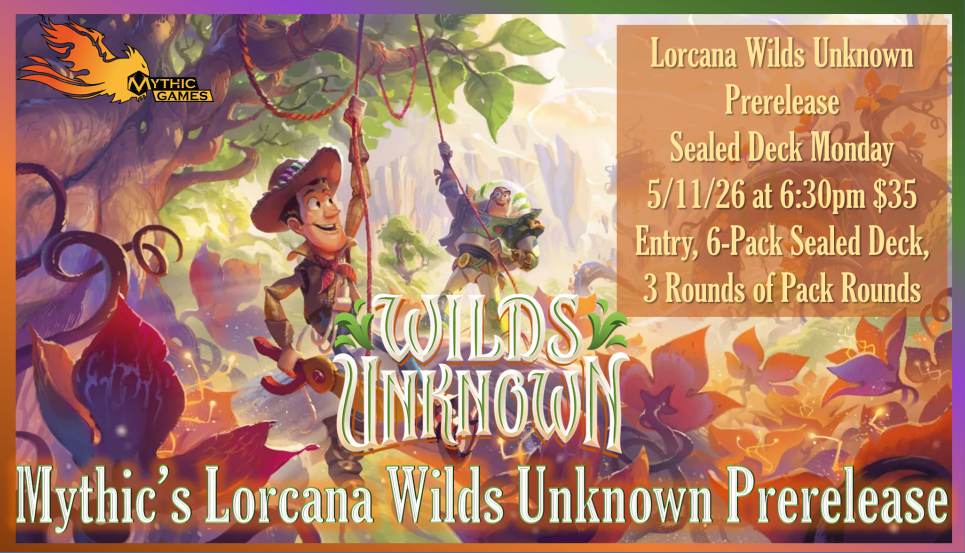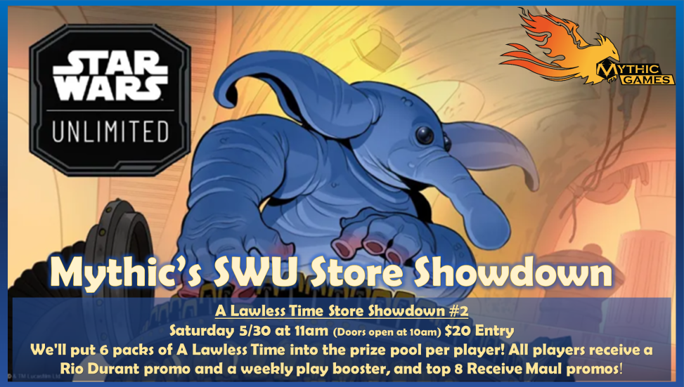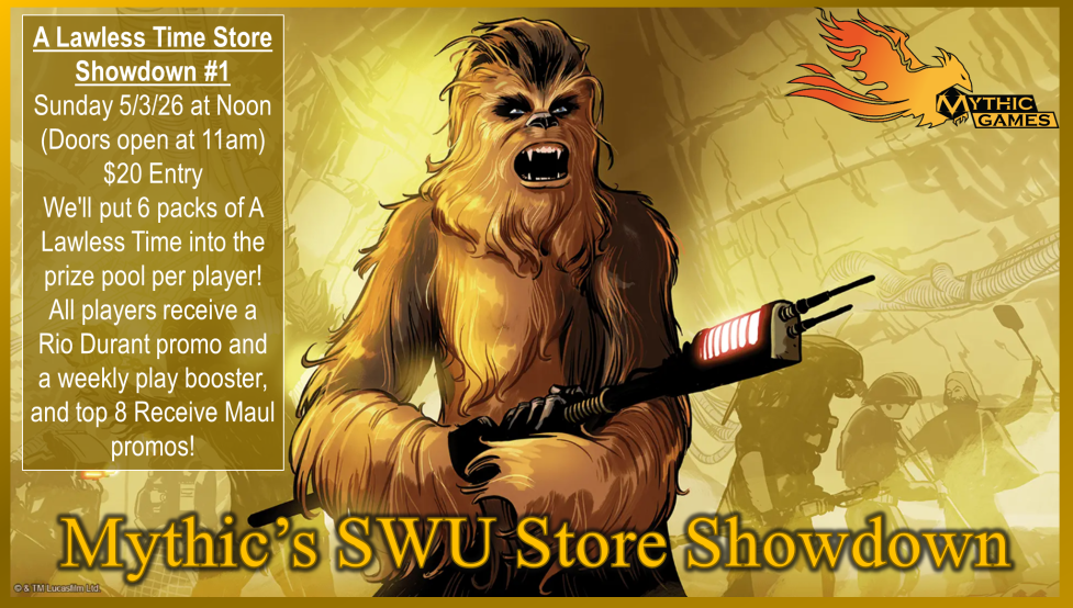 Star wars unlimited Sealed Deck Saturday at Mythic Games! Players will use a Prerelease Kit to build their deck! $35 Entry, Starts at Noon, each player gets A Lawless Time Prerelease Kit to build their deck. We’ll run 4 rounds of pack rounds! Plus undefeated players get 3 more packs and all participants get weekly play packs! All players receive an extra 10% on their Star Wars Unlimited Trade-Ins.