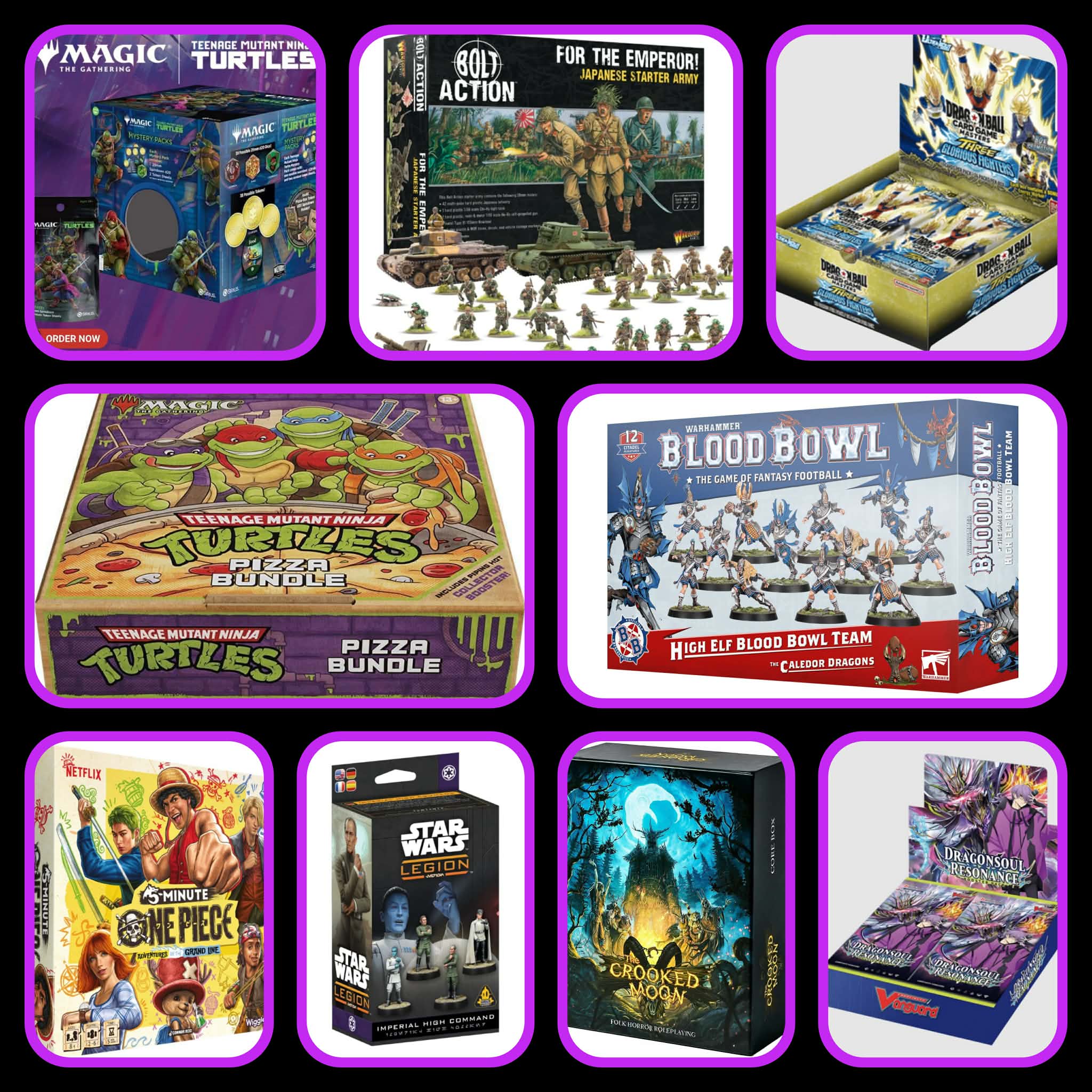 Warhammer 40K: Emperor’s Children – Blissbound Warband, Astra Militarum – Krieg Siege Platoon, Space Marines – Iron Halo Strike Force, Chaos Space Marines – Hellforged Warband, Tyranids – Crusher Stampede, T’au Empire – Farsight Cadre, & Leagues of Votann – Cthonian Prospect