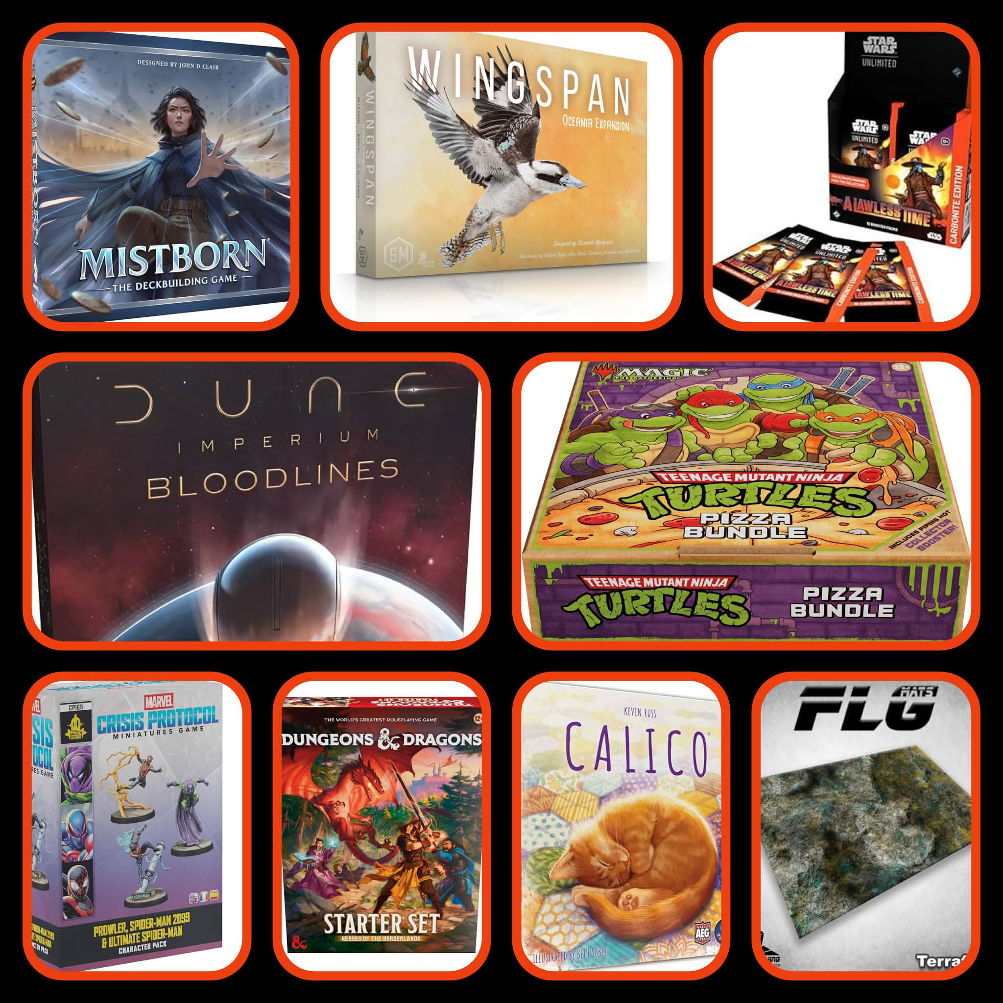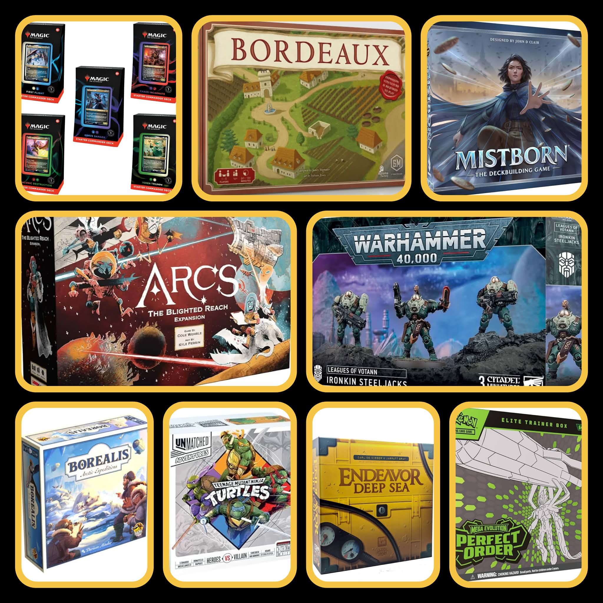 MTG: TMNT Pizza Bundles, TMNT Bundles, Bloomburrow Commander Decks, ATLA Beginner Box, Lorwyn Eclipsed Commander Decks, Modern Horizons 3 Play Boosters, Modern Horizons 3 Commander Decks, Foundations Starter Collection, Starter Commander Decks, ATLA Token Set, Squire Plus Deck Boxes, Boulders, Playmats, Binders, & TMNT Treasure Dice Packs